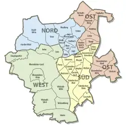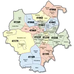 Since 2009, the territory of Mönchengladbach has comprised four (previously ten) boroughs which are subdivided into 44 districts.[9]
