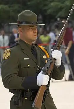 The 1st Battalion of the 3rd United States Infantry Regiment ("The Old Guard") in the Military District of Washington is the sole remaining regular U.S. Army combat field unit where the M14 is still issued as the standard rifle, along with a chromed bayonet and an extra wooden stock with a white sling for military funerals, parades, and other ceremonies. The United States Air Force Honor Guard uses a version of the M14.[35] The U.S. Navy Ceremonial Guard and Base Honor Guards also use the M14 for three-volley salutes in military funerals. It is also the drill and parade rifle of the United States Military Academy, United States Naval Academy, United States Air Force Academy, The Citadel, Norwich University, Virginia Military Institute, and the University of North Georgia.[36] U.S. Navy ships carry several M14s in their armories. They are issued to sailors going on watch out on deck in port, and to backup alert forces. The M14 is also used to shoot a large rubber projectile to another ship when underway to start the lines over for alongside refueling and replenishment.[37]