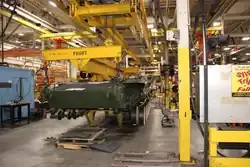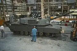Eleven XM1 preproduction models were manufactured between February and July 1978 at Detroit Arsenal Tank Plant.[41] Quality problems with the engine quickly became apparent in testing. The first preproduction units that arrived at Aberdeen Proving Ground in March 1978 had serious problems. The tank accumulated mud and dirt under the hull which led to thrown tracks. Chrysler installed a scraper to prevent the build-up of dirt, but this did not solve the issue entirely. It was determined months later that a gauge used to tension tracks was miscalibrated. This caused the tracks to be fitted too loosely.[42] Another problem was the ingestion of debris by the engine. The problem was determined to be caused by poorly fitting air filters.[42] The 60 Minutes news program reported in 1980 on a faulty air filter induction system, but an Army spokesperson said that the problem was resolved prior to the airing of the episode.[43] At Fort Bliss, several tanks experienced transmission issues. It was determined that the tankers at Fort Bliss had discovered that they could throw the vehicle directly from acceleration into reverse, a tactically advantageous maneuver called the "bow tie". Chrysler resolved this by installing a device that prevented this.[42] The problems found during testing were easily surmounted. Critics of the M1 program emerged in the early 1980s, particularly the newly formed Project on Military Procurement (PMP) (later renamed the Project on Government Oversight). PMP took issue with the tank's vulnerability, high price, reliance on flammable hydraulics, and high fuel consumption.[44] Responding to some of the alleged issues with the tank in King of the Killing Zone (1989), journalist Orr Kelly wrote that "The truth is close to the opposite", and that the program "ranks as one of the Army's best managed", producing a tank in "a remarkably short time" while avoiding "gold-plating" and utilizing effective competition.[45] American tank historian Steven J. Zaloga characterized American press criticism of the M1 during this time as "ill-founded" and that the issues uncovered by the tank trials were "not particularly serious".[46] PMP's criticism failed to generate any serious opposition to the program, which maintained strong support from Congress and the Pentagon.[47]