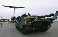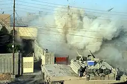 Several Abrams tanks that were irrecoverable due to loss of mobility or other circumstances were destroyed by friendly forces, usually by other Abrams tanks, to prevent their capture.[74] Some Abrams tanks were disabled by Iraqi infantrymen in ambushes during the invasion. Some troops employed short-range anti-tank rockets and fired at the tracks, rear and top. Other tanks were put out of action by engine fires when flammable fuel stored externally in turret racks was hit by small arms fire and spilled into the engine compartment.[75][76] By March 2005, approximately 80 Abrams tanks had been forced out of action by enemy attacks;[77] 63 were shipped back to the U.S. for repairs, while 17 were damaged beyond repair[78] with 3 of them at the beginning of 2003.[79]