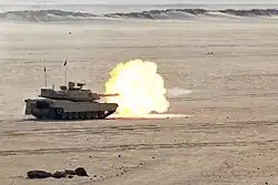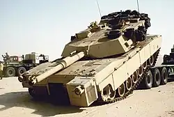 The Abrams remained untested in combat until the Gulf War in 1991, during Operation Desert Storm. The first Abrams tanks to arrive in Saudi Arabia in August 1990 in the buildup to the war were M1 and IPM1 tanks with 105 mm guns.[58] All but two battalions of 105 mm gun Abrams tanks were replaced by M1A1 tanks prior to the American invasion in January 1991.[59] The U.S. Army deployed a total of 1,956 M1A1s (733 M1A1, 1,233 M1A1HA) to Saudi Arabia to participate in the liberation of Kuwait.[60] The U.S. Marine Corps deployed 353 tanks, of which 277 were M60s and 76 were M1A1 (60 M1A1HA and 16 M1A1 Common). The M1A1 Common variant included adaptations for deep wading and improvements to increase commonality with the Army's Abrams. The 2nd Tank Battalion was equipped with M1A1HA Abrams borrowed from the Army.[58]