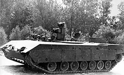In 1963, the U.S. Army and the West German Bundeswehr began collaborating on a main battle tank (MBT) design that both nations would use, improving interoperability between the two NATO partners.[11][12][13] The MBT-70, or Kampfpanzer 70 as it was known in Germany,[14] incorporated many new unconventional technologies. Conventional tanks of the time had a crew of four, with the driver located in the hull. In the MBT-70, the loader crewmember would be replaced by a mechanical autoloader and the driver would be located inside the NBC-protected turret with the other two crewmembers.[15][16] Like the M60A2 MBT and M551 Sheridan light tank then under development, the MBT-70 was armed with a 152 mm gun-launcher that, in addition to firing conventional ammunition, would also fire the Shillelagh missile.[17][12][18] A hydropneumatic suspension provided improved cross-country ride quality and also allowed the entire tank to be raised or lowered by the driver.[19]