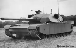 In January 1973, the U.S. Army issued the XM1 (as the XM815 had been renamed in November 1972) request for proposals.[30] The new tank had to defeat any hit from a Soviet gun within 800 m (2,600 ft) and 30 degrees to either side. The tank would be armed with the 105 mm M68 gun, a licensed version of the Royal Ordnance L7, and a 20 mm version of the M242 Bushmaster.[31] The Army later deleted the latter from the design.[32] In May 1973, Chrysler Defense and General Motors submitted proposals. Both were armed with the 105 mm M68 gun, the licensed L7, and the 20 mm Bushmaster. Chrysler chose a 1,500 hp Lycoming AGT1500 gas turbine engine. GM's model was powered by a 1,500 hp diesel engine similar to that used on the American MBT-70 and XM803.[33]