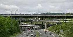 To the west, the M25 passes close to the edge of Heathrow Airport, and within sight of Windsor Castle.[15] North of this, it goes under the Chalfont Viaduct railway bridge, completed in 1906, which carries the Chiltern Main Line. Red kites can often be seen overhead to the north of this, up to junction 21. The northern section of the M25 passes close to All Saints Pastoral Centre near London Colney, Waltham Abbey and Copped Hall.[12][13] This section also features two cut-and-cover tunnels, including the Bell Common Tunnel.[13] The north-eastern section of the motorway passes close to North Ockendon, the only settlement of Greater London situated outside the M25.[16] It then runs close to the Rainham Marshes Nature Reserve before reaching the northern end of the Dartford Crossing.[12]