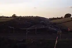 There was no individual public inquiry into the M25 as a whole.[36] Each section was presented to planning authorities in its own right and was individually justified, with 39 separate public inquiries relating to sections of the route. The need for the ministry to negotiate with local councils meant that more junctions with local traffic were built than originally proposed.[37] A report in 1981 showed that the M25 had the potential to attract office and retail development along its route, negating the proposed traffic improvements and making Central London a less desirable place to work.[38] None of the motorway was prevented from being built by objections at the public inquiries.[39] However, as a consequence of the backlash against the Ringways, and criticism at the public inquiries, the motorway was built with environmental concerns in mind. New features included additional earth mounds, cuttings and fences that reduced noise, and over two million trees and shrubs to hide the view of the road.[40]