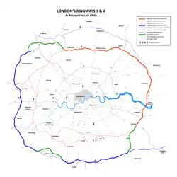 In 1964, the London County Council announced the London Ringways plan, to consist of four concentric motorway rings around London.[33] The following year, the transport minister Barbara Castle announced that the D Ring would be essential to build. The component parts of what became the M25 came from Ringway 3 / M16 motorway in the north and Ringway 4 in the south.[32]