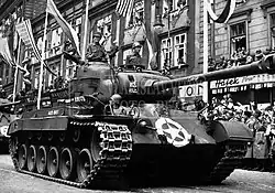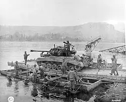A platoon of five M26s, less one that was being serviced, played a key role in helping Combat Command B of the 9th Armored capture the Ludendorff Bridge during the Battle of Remagen on 7–8 March 1945, providing fire support to the infantry in order to take the bridgehead before the Germans could blow it up. In encounters with Tigers and Panthers, the M26 performed well.[54] Some of the division's other tanks were able to cross the bridge, but the T26E3s were too large and heavy to cross the damaged bridge and had to wait five days before getting across the river by barge.[55] Europe's bridges were in general not designed for heavy loads, which had been one of the original objections to sending a heavy tank to Europe.