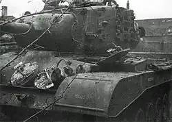 A single Super Pershing (T26E4) was shipped to Europe and given additional armor to the gun mantlet and front hull by the maintenance unit before being assigned to one of the tank crews of the 3rd Armored Division. The new gun on the Super Pershing could pierce 13 inches (330 mm) of armor at 100 yards (91 m). The front hull was given two 38.1 mm steel boiler plates, bringing the front up to 38.1+ 38.1+102 mm of armor. The plates were applied at a greater slope than the underlying original hull plate. The turret had 80 mm thick Rolled Homogeneous Armor (RHA) plate from a Panther upper glacis welded to the mantlet, covering the entire front of the mantlet. There were 3 holes cut in the plate one for the gunner’s sight, one for the barrel of the gun, and one for the M1919A4 .30 cal coaxial machine gun. This added about five tonnes to the tank weight, requiring extra armor added to the turret for balance, two 80 mm plates welded to the left and right of the gun mantlet, as well as a weight in the back of the turret in the form of an approximately 2,200 lb turret bustle.[56] An account of the combat actions of this tank appeared in the war memoir Another River, Another Town, by John P. Irwin, who was the tank gunner. On 4 April, between Weser and Nordheim, the Super Pershing engaged and destroyed a German tank, or something resembling a tank, at a range of 1,500 yd (1,400 m). According to Zaloga, it is possible this vehicle was a Jagdpanther from the 507th Heavy Panzer Battalion. On 12 April, the Super Pershing claimed a German tank of unknown type. On 21 April, the Super Pershing was involved in a short-range tank duel with a German tank, which it knocked out with a shot to the belly. Irwin described this German tank as a Tiger II, but Zaloga was skeptical of this claim.[57][58] The tank was likely a Panzer IV.[59] After the war, the single Super Pershing in Europe was last photographed in a vehicle dump in Kassel, Germany, and was most likely scrapped.[60]