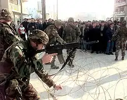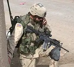 Interest in the M4 carbine was accelerated after the Battle of Mogadishu (1993), in which Rangers complained that their M16 rifles were "unwieldy", whereas members of Delta Force in the same battle, equipped with the CAR-15, had no such complaints.[19] The M4 carbine first saw action in the hands of U.S. troops deployed to Kosovo in 1999 in support of the NATO-led Kosovo Force.[20] It would subsequently be used heavily by U.S. forces during the war on terror, including in Operation Enduring Freedom and the Iraq War.[20] In the Army, the M4 had largely replaced M16A2s as the primary weapon of forward deployed personnel by 2005.[21] The M4 carbine also replaced most submachine guns and selected handguns in U.S. military service,[21] as it fires more effective rifle ammunition that offers superior stopping power and is better able to penetrate modern body armor.[20]