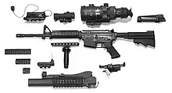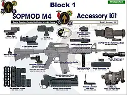 In 1992, U.S. Special Operations Command (USSOCOM) developed the Special Operations Peculiar Modification (SOPMOD) Block I kit for the carbines used by US Special Operations Forces units operating under its command.[64] The kit features an M4A1, a Rail Interface System (RIS) handguard developed by Knight's Armament Company (KAC), a shortened quick-detachable M203 grenade launcher and leaf sight, a KAC sound suppressor, a KAC back-up rear sight, an Insight Technologies AN/PEQ-2A visible laser/infrared designator, along with Trijicon's ACOG TA-01NSN model and Reflex sights, and a night vision sight, among many other accessories.[65] This kit was designed to be configurable (modular) for various missions, and the kit is currently in service with special operations units.[64]