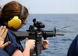 In 2007, the USMC ordered its officers (up to the rank of lieutenant colonel) and staff non-commissioned officers to carry the M4 carbine instead of the M9 handgun.[22] This is in keeping with the Marine Corps doctrine, "Every Marine a rifleman."[23] The Marine Corps, however, chose the full-sized M16A4 over the M4 as its standard infantry rifle. United States Navy corpsmen E5 and below are also issued M4s instead of the M9.[24] While ordinary riflemen in the Marine Corps were armed with M16A4s, M4s were fielded by troops in positions where a full-length rifle would be too bulky, including vehicle operators, fireteam and squad leaders. As of 2013, the U.S. Marine Corps had 80,000 M4 carbines in their inventory.[25][26]