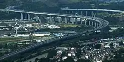 The elevated section of the M4 in West London, built in the 1960s, is mostly directly above the A4 and extends over parts of Brentford's Golden Mile. This section was designed to have a heated road surface to reduce icing in winter.[41][42]