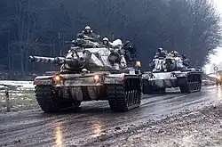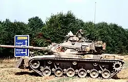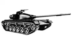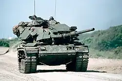 The M60 is an American second-generation main battle tank (MBT). It was officially standardized as the Tank, Combat, Full Tracked: 105-mm Gun, M60 in March 1959.[1] Although developed from the M48 Patton, the M60 tank series was never officially christened as a Patton tank. It has been called a "product-improved descendant" of the Patton tank's design.[14] The design similarities are evident comparing the original version of the M60 and the M48A2. The United States fully committed to the MBT doctrine in 1963, when the Marine Corps retired the last (M103) heavy tank battalion. The M60 tank series became the American primary main battle tank during the Cold War,[15] reaching a production total of 15,000 M60s.[16] Hull production ended in 1983, but 5,400 older models were converted to the M60A3 variant ending in 1990.[5]