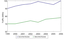 Annual average daily traffic flows of 100,000 cars were recorded east of the Pennines (junction 22) in 2006 and 78,000 cars west of the Pennines.[32] The figures were increases from 90,000 and 70,000 respectively in 1999.[33] By way of comparison, the UK's busiest motorway, the M25 carried 144,000 cars between junctions 7 and 23 in 2006.[32]
