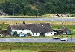 The first section of the motorway in Yorkshire was completed between the county boundary at Windy Hill and Outlane in 1970.[14] To build this section, 12,000,000 cubic yards (9,200,000 m3) of material was moved, 8,000,000 cubic yards (6,100,000 m3) of which was solid rock and 650,000 cubic yards (500,000 m3) of peat which had to be cut from the rock strata and deposited on adjacent hillsides. The geology of the moors resulted in the engineers splitting the carriageways for 3⁄4 mile (1.2 km) in the middle of this section, sparing Stott Hall Farm from demolition.[14][15] The farm, which was built in the 18th century, remains the only one situated in the middle of a UK motorway.[16]