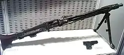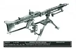 For the medium machine gun role a large tripod, the Lafette 42, was available that included a number of features, such as recoil absorbing buffer springs, a Zielfernrohrhalter (optical sight mounting bracket) for mounting an MG Z 34 or MG Z 40 periscope-type 4× power telescopic sight containing special sighting equipment for indirect fire, or the late World War II MG Z 44, designed for direct fire only.[50] Fitting such an optical sight enabled the machine gun to deliver direct fire out to 3,000 m (3,281 yd). An accessory to lengthen these sights' periscope was available to use these sights behind cover. The Lafette could be set up in a prone, kneeling or high position. The Lafette 42 weighed 20.5 kg (45.2 lb) on its own and was a simplified version of the Lafette 34 used for the MG 34, as the MG 42 could be operated more easily from a Lafette and featured no semi-automatic firing mode. The legs could be extended with a Lafetteaufsatzstück to allow it to be used in the low level anti-aircraft role, and when lowered, it could be placed to allow the gun to be fired "remotely" while it swept an arc in front of the mounting with fire. Mounted to the Lafette and aimed through the MG Z 34 or MG Z 40 telescopic sight, the effective range of the MG 42 could be extended out to 3,500 m (3,828 yd) when fired indirectly. The indirect firing method exploits the s.S. Patrone useful maximum range, that is defined by the maximum range of a small-arms projectile while still maintaining the minimum kinetic energy required to put unprotected personnel out of action, which is generally believed to be 15 kilogram-meters (147 J / 108 ft⋅lbf).[51] The Lafette 42 tripod also had a bolt box to store a (spare) bolt and return spring.[52]