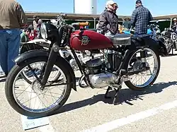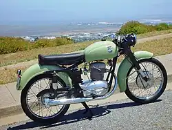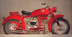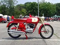 In the end of 1946, a special racing motorcycle was assembled at the factory in Caschina Costa. Its main advantages over the serial model 98 were a telescopic fork and a plunger type rear suspension. The frame remained a simple tubular (closed type) and was shortened by 50 mm to improve the handling. The handle bar was narrowed and the rearsets were moved back to make a sportier riding position. The two-stroke engine was improved by enlarging the cylinders ports, raising the compression ratio and installing a new 20 mm horizontal carburetor. The number of gears was increased from two to three. As a result, the power increased to 5 hp at 5,400 rpm, and the maximum speed increased to 95 km/h.[3][4]