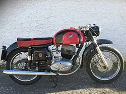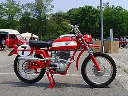 In the early 1960s, MV Agusta decided to return to offroad sport (at the end of the 1950s, MV racers were successful in enduro races, including in the famous Six Days race).[3] A new 125 Regolarita was created by order of Fiamme Oro team. The model was equipped with a 125-cc engine boosted up to 12.5 hp and a five-speed gearbox. Traditionally light MV frame was reinforced with a lower subframe, becoming closed. 19-inch wheels got offroad tyres. This motorcycle became successful, so tens such motorcycles were also sold amateur racers.[23] Moreover, a five-speed gearbox has become standard for 125-cc and 150-cc road motorcycles since 1966, the factory line-up was supplemented by the Scrambler version.[3]