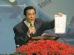 In 1993, Ma received national attention when President Lee Teng-hui and Premier Lien Chan appointed him as Minister of Justice.[49] At age 43, he was considered a "handsome new official" whose dynamism made him a "darling of public opinion".[50] He initiated hardline policies of prosecuting corruption, power abuse, and political scandals, drawing criticism from KMT party officials, some of whom were involved in, and reliant on, local corruption.[48] Among the anti-corruption programs instituted was the "Taking the Knife to Corruption" plan centered on a doctrine of "incorruptibility and ability" in government.[51] KMT officials complained that he "shook the foundations of the party" as 341 of 883 elected councilmen in 1994 were indicted for buying votes.[52] His campaigns against vote buying while in office earned him the nickname "Mr. Clean".[53] In addition, he began an anti-drug campaign and organized the ministry to restrict narcotics.[54]
