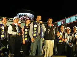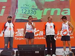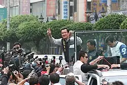 The 1997 Taiwanese local elections saw the Kuomintang lose a majority of their counties and cities to the Democratic Progressive Party, largely due to the efforts of Chen Shui-bian, Taipei's incumbent mayor, to travel extensively from each county and city for campaigns. Faced with a political crisis, the KMT nominated the popular Ma as its 1998 candidate for the Taipei mayoralty against Chen.[58] Ma ran on a platform of making Taipei a corruption-free "world class city" and used an image of a jogger—a representation of his penchant for jogging and charity work—as the symbol of his campaign.[59][60] He received the support of incumbent president Lee Teng-hui, who campaigned for Ma and promoted him as a "new Taiwanese" who "loves Taiwan and promotes its interests regardless of his or her place of birth".[61] Ma's campaign slogan was "Taiwan First, Taipei First".[62]