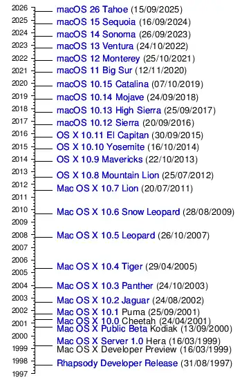 A prominent part of macOS's original brand identity was the use of the Roman numeral X, pronounced "ten", as well as code naming each release after species of big cats, and later, places within California.[18] Apple shortened the name to "OS X" in 2011 and then changed it to "macOS" in 2016 to align with the branding of Apple's other operating systems.[19] In 2020, macOS Big Sur was presented as version 11—a marked departure after 16 releases of macOS 10—but the naming convention continued to reference places within California. In 2025, Apple unified the version number across all of its products to align with the year after their WWDC announcement, so the release announced at the 2025 WWDC, macOS Tahoe, is macOS 26.[20]