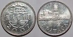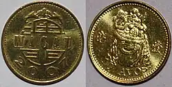 The Macanese pataca or Macau pataca (Chinese: 澳門元; Cantonese Yale: Oumún yùhn; Portuguese: Pataca de Macau; sign: MOP$;[4][5] ISO code: MOP) is the currency of Macau. It is subdivided into 100 avos (; sin), with 10 avos called ho () in Cantonese.