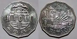 Brass 10, 20 and 50 avos and cupro-nickel 1 and 5 patacas were introduced in 1982. The 20 avos and 5 patacas became dodecagonal in 1993 and 1992, respectively, whilst a bimetallic 10 patacas was introduced in 1997 and a cupronickel 2 patacas in 1998. Coins are issued by the Monetary Authority of Macau.