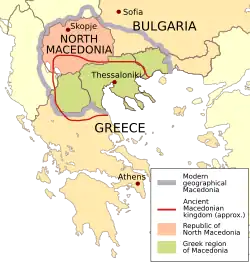 The dispute arose from the ambiguity in nomenclature between the Republic of Macedonia, the adjacent Greek region of Macedonia and the ancient Greek kingdom of Macedon. Citing historical and irredentist concerns, Greece opposed the use of the name "Macedonia" without a geographical qualifier such as "Northern Macedonia" for use "by all ... and for all purposes".[1] As a significant contingent of ethnic Greeks identify themselves as Macedonians and view themselves as unrelated to ethnic Macedonians, Greece further objected to the use of the term "Macedonian" for the neighboring country's largest ethnic group and language. North Macedonia was accused by Greece of appropriating symbols and figures that are historically considered part of Greek culture such as the Vergina Sun and Alexander the Great, and of promoting the irredentist concept of a United Macedonia, which involves territorial claims on Greece, Bulgaria, Albania, and Serbia.[2]