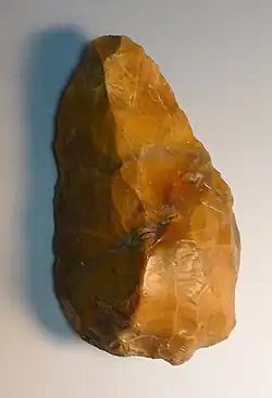 The hand axe, made by chipping flint to form a wedge, in the hands of a human transforms force and movement of the tool into a transverse splitting forces and movement of the workpiece. The hand axe is the first example of a wedge, the oldest of the six classic simple machines, from which most machines are based. The second oldest simple machine was the inclined plane (ramp),[6] which has been used since prehistoric times to move heavy objects.[7][8]