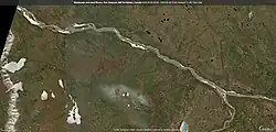 About 30 kilometres (19 mi) northwest of Tsiigehtchic is Point Separation, the head of the vast Mackenzie River Delta, whose branching channels, ponds and wetlands spread across more than 12,000 square kilometres (4,600 sq mi) of the coastal plain. The delta is nearly 210 kilometres (130 mi) from north to south, and ranges in width from 50 to 80 kilometres (31 to 50 mi). It is the second biggest Arctic delta in the world, after the Lena River delta in Russia. Most land in the Mackenzie delta consists of permafrost, which reaches as deep as the bedrock. A characteristic feature of the delta is its numerous pingos, or hills of earth-covered-ice – some 1,400 of them.[22] The Peel River, carrying much of the runoff from the northern Yukon, joins in the delta at a point northeast of Fort McPherson. Below there, the Mackenzie diverges into several large channels with the largest heading north-northeast, emptying into the Beaufort Sea west of Tuktoyaktuk.[23][24][25][26] The Mackenzie Delta contains a logjam with 400,000 caches of wood, which stores 3.4 million tons of carbon, equivalent to a year's emissions from 2.5 million cars.[27]