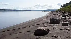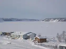 The river discharges more than 325 cubic kilometres (78 cu mi) of water each year, accounting for roughly 11% of the total river flow into the Arctic Ocean.[34][35] The river is frozen for most of the year, with the ice typically breaking up by early to mid-May in the south, and late May-early June in the north.[36] Ice breaks up earlier on the tributaries, sometimes causing ice jams and flooding where they meet the Mackenzie. In the middle of the larger lakes, such as Great Slave, ice can persist as late as mid-June. The river typically freezes by late October or November, starting in the north. Year round, the Mackenzie's outflow has a major stabilizing effect in the local climate above the Arctic Ocean with large amounts of warmer fresh water mixing with the cold seawater.[23]