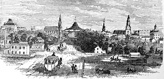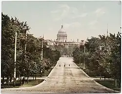 The cornerstone for the Wisconsin capitol was laid in 1837, and the legislature first met there in 1838. On October 9, 1839, Kintzing Prichett registered the plat of Madison at the registrar's office of the then-territorial Dane County.[26] Madison was incorporated as a village in 1846, with a population of 626. When Wisconsin became a state in 1848, Madison remained the capital, and in 1849 it became the site of the University of Wisconsin (now University of Wisconsin–Madison). The Milwaukee & Mississippi Railroad (a predecessor of the Milwaukee Road) connected to Madison in 1854. Madison incorporated as a city in 1856, with a population of 6,863, leaving the unincorporated remainder as a separate Town of Madison.[27] The original capitol was replaced in 1863 and the second capitol burned in 1904. The current capitol was built between 1906 and 1917.[28]