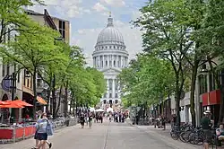 Capitol Square is Madison's central business district, featuring high-rise apartments, hotels, restaurants, shops, museums and the Wisconsin State Capitol.[42] It hosts public events including the Dane County Farmers' Market, Concerts on the Square, and the Art Fair on the Square.[43] State Street connects the University of Wisconsin campus to Capitol Square and is home to numerous bars and theaters.[44] Langdon Street is another main road in the area, known for its fraternity and sorority houses.[45]