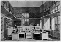 Daubeny, who was also the Aldrichian Professor of Chemistry, had found the chemistry laboratory in the basement of the old Ashmolean Museum, what is now the History of Science Museum, to be "notoriously unworthy of a great University" and desired a better science facility. He petitioned the college to be allowed to build one, and the Daubeny laboratory was completed in 1848.[49][52] The Daubeny Laboratory was preceded by the anatomy school and laboratory at Christ Church which opened in 1767, and would be followed later in the century by other college laboratories including the Balliol-Trinity Laboratories.[53] Daubeny's laboratory was a two-storey room with benches and cupboards encircled by a gallery, and became the principal chemistry lab for the university. In 1902, due to growing student numbers and poor ventilation, the laboratory trappings were removed and it was refitted as a lecture hall.[49] In 1973, most of the Daubeny Laboratory building was reconfigured into graduate student accommodation.[54] The Daubeny lab itself is now a conference space.