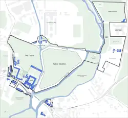 Map of Magdalen College buildings and grounds, marked out in black.