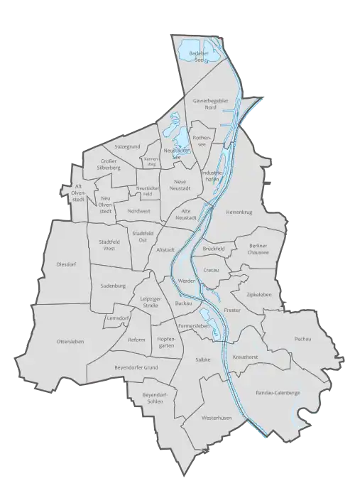 The city of Magdeburg is divided into 40 Stadtteile (districts).[32] Three of these, the former municipalities Beyendorf-Sohlen, Pechau and Randau-Calenberge, have a special status as Ortschaften.[33] The Stadtteile of Magdeburg are:[32]