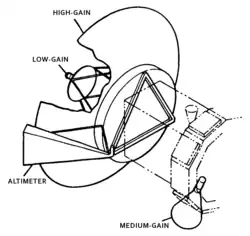 For communications, the spacecraft included a lightweight graphite/aluminum, 3.7-meter high-gain antenna left over from the Voyager Program and a medium-gain antenna spare from the Mariner 9 mission. A low-gain antenna attached to the high-gain antenna was also included for contingencies. When communicating with the Deep Space Network, the spacecraft was able to simultaneously receive commands at 1.2 kilobits/second in the S-band and transmit data at 268.8 kilobits/second in the X-band.[4][5][11][12]