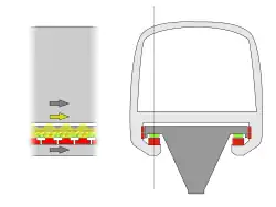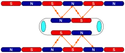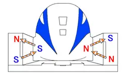 In electrodynamic suspension (EDS), both the guideway and the train exert a magnetic field, and the train is levitated by the repulsive and attractive force between these magnetic fields.[81] In some configurations, the train can be levitated only by repulsive force. In the early stages of maglev development at the Miyazaki test track, a purely repulsive system was used instead of the later repulsive and attractive EDS system.[82] The magnetic field is produced either by superconducting magnets (as in JR–Maglev) or by an array of permanent magnets (as in Inductrack). The repulsive and attractive force in the track is created by an induced magnetic field in wires or other conducting strips in the track.