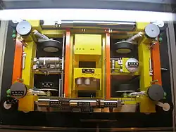 The world's first commercial maglev system was a low-speed maglev shuttle that ran between the airport terminal of Birmingham Airport and the nearby Birmingham International railway station between 1984 and 1995.[37] Its track length was 600 metres (2,000 ft), and trains levitated at an altitude of 15 millimetres [0.59 in], levitated by electromagnets, and propelled with linear induction motors.[38] It operated for 11 years and was initially very popular with passengers,[39] but obsolescence problems with the electronic systems made it progressively unreliable[40] as years passed, leading to its closure in 1995. One of the original cars is now on display at Railworld in Peterborough, together with the RTV31 hover train vehicle. Another is on display at Locomotion Museum in Shildon, County Durham.[41]