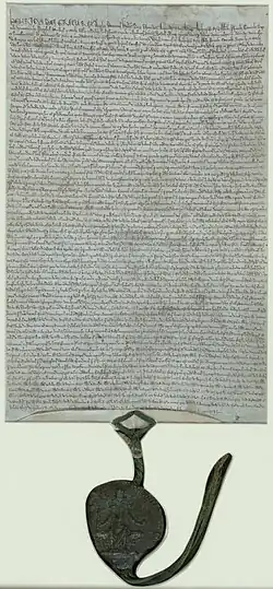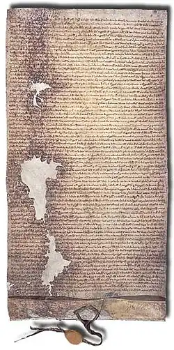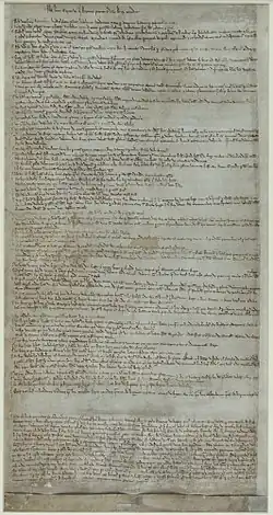 John held a council in London in January 1215 to discuss potential reforms, and sponsored discussions in Oxford between his agents and the rebels during the spring.[20] Both sides appealed to Pope Innocent III for assistance in the dispute.[21] During the negotiations, the rebellious barons produced an initial document, which historians have termed "the Unknown Charter of Liberties", which drew on Henry I's Charter of Liberties for much of its language; seven articles from that document later appeared in the "Articles of the Barons" and the subsequent charter.[22][23][24]