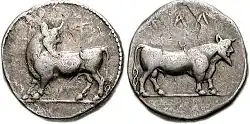 5th-century BC Greek coins of Taras (now Taranto) with the eponym Taras hero riding a dolphin -