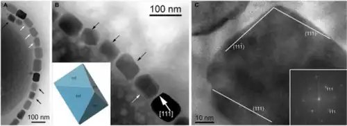 Hydrothermal synthesis usually produces single octahedral crystals which can be as large as 10 millimetres (3⁄8 inch) across.[15] In the presence of mineralizers such as 0.1 M HI or 2 M NH4Cl and at 0.207 MPa at 416–800 °C, magnetite grew as crystals whose shapes were a combination of rhombic-dodechahedra forms.[15] The crystals were more rounded than usual. The appearance of higher forms was considered as a result from a decrease in the surface energies caused by the lower surface to volume ratio in the rounded crystals.[15]