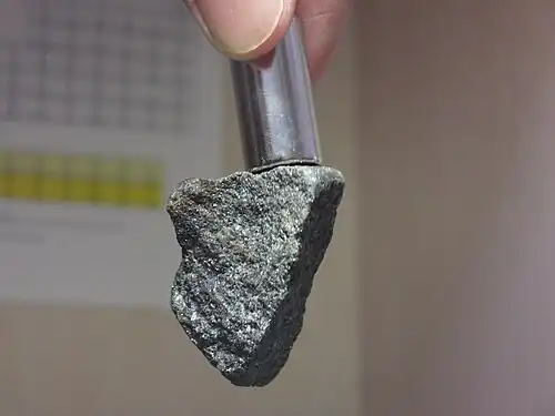 Magnetite is a mineral and one of the main iron ores, with the chemical formula Fe2+Fe3+2O4. It is one of the oxides of iron, and is ferrimagnetic;[6] it is attracted to a magnet and can be magnetized to become a permanent magnet itself.[7][8] With the exception of extremely rare native iron deposits, it is the most magnetic of all the naturally occurring minerals on Earth.[7][9] Naturally magnetized pieces of magnetite, called lodestone, will attract small pieces of iron, which is how ancient peoples first discovered the property of magnetism.[10]