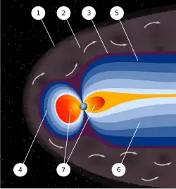 An artist's rendering of the structure of a magnetosphere: 1) Bow shock. 2) Magnetosheath. 3) Magnetopause. 4) Magnetosphere. 5) Northern tail lobe. 6) Southern tail lobe. 7) Plasmasphere.