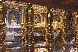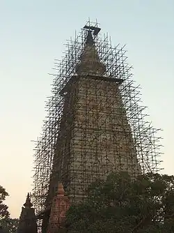 In August 2013, Bihar chief minister Nitish Kumar said the Archaeological Survey of India (ASI) had accepted a proposal to decorate the Mahabodhi Temple's dome with gold, subject to terms and conditions.[63] News reports later described the project as being carried out under ASI supervision using gold donations from Thailand, widely reported as 289 kg (often rounded in headlines to "nearly 300 kg"), including donations attributed to the Thai king and Thai devotees; one report put the amount at 280 kg.[64][65][66] The Hindustan Times report said only the top 18 feet of the 180-foot-high structure would be covered with gold after preparatory chemical treatment.[65][67]