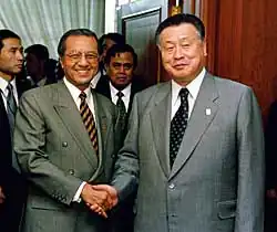 Shortly after taking office, Mahathir, in collaboration with Singaporean Prime Minister Lee Kuan Yew, initiated efforts to standardize Malaysia's time zones.[92] Mahathir introduced and passed the Malaysian Standard Time Act, which came into effect on 31 December 1981, setting the clocks forward by 30 minutes to GMT+8.[93] This legislation, championed by Mahathir, not only unified the time zones of East and Peninsular Malaysia but also aligned the country with regional economic hubs such as Hong Kong, Manila, and Perth.[92]