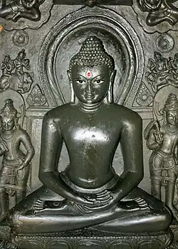 ![]() An 11th century CE sculpture of Tirthankar Mahavira seated in meditation on a lion throne | |