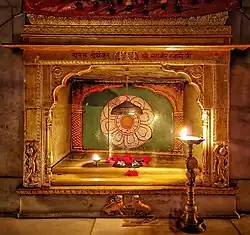 The Jain Śvētāmbara tradition believes that Mahavira's nirvana occurred in 527 BCE, and the Digambara tradition holds that date of 510 BCE.[1] In both traditions, his jiva (soul) is believed to abide in Siddhashila (the home of liberated souls).[107] Mahavira's Jal Mandir stands at the place where he is said to have attained nirvana (moksha).[111] Artworks in Jain temples and texts depict his final liberation and cremation, sometimes shown symbolically as a small pyre of sandalwood and a piece of burning camphor.[112]