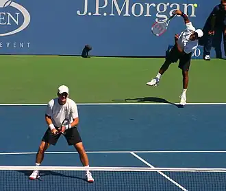 Mahesh Bhupathi is known for his strong serve. According to Rafael Nadal, his strong backhand makes him the best for an Ad Court player. Roger Federer acclaims him as one of the best doubles players of all time.[15] He often discusses strategies between the serves with his partner during the match and also communicates using finger-at-the-back signals.