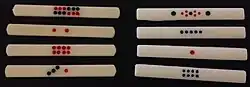 The bamboo suit is also known as "sticks", "strings" or "bams" suit; the first tile usually has a bird (traditionally, a peacock or sparrow) instead of a single bamboo. The dots suit is also known as the "wheels", "circles", "coins", "stones", "marbles" or "balls" suit. The characters suit is also known as the "myriads", "cracks" or "numbers" suit since the top characters are numbers in the Chinese writing system, and the bottom characters (in traditional Chinese characters) are the Chinese character for "ten thousand".[9]
